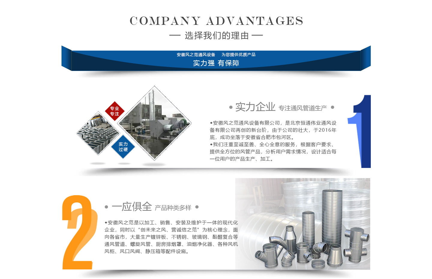 安徽風之范通風設備有限公司,是北京恒通偉業(yè)通風設備有限公司再創(chuàng)的新臺階,多年來,公司員工憑著“誠信敬業(yè)、團結拼搏、勇于開拓、務實進取”的企業(yè)精神,先后承接了多項重點工程項目,使公司健康穩(wěn)步發(fā)展。現由于公司的壯大,業(yè)務的拓展,又于2016年底,成功坐落于安徽省合肥市包河區(qū)。本公司生產設備精良,技術力量雄厚,質保體系完善!讓用戶體驗到,貼心的服務,無憂的售后!風之范是以加工、銷售、安裝及維護于一體的現代化企業(yè),同時以“創(chuàng)未來之風、營誠信之范”為核心理念,面向全國各省市,大量生產鍍鋅板、不銹鋼、玻璃鋼、酚醛復合等通風管道、螺旋風管、廚房排煙罩、油煙凈化器、各種風機風柜、風口風閥、靜壓箱等配件設施。廣泛承接商場、工廠、酒店、寫字樓、地下室等,消防排煙工程、除塵凈化工程、室內通風工程、暖通空調工程、廚房排煙凈化工程。我們力求上進,追求,歡迎各界人士技術指導,經濟合作,共創(chuàng)美好明天!